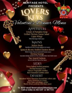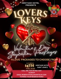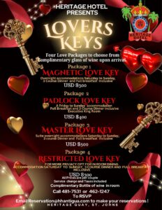 Heritage Hotel presents Lovers Keys Valentines Staycation Promotion. Call to RSVP 481-7531 or 462-1247 or email reservation@hhantigua.com
